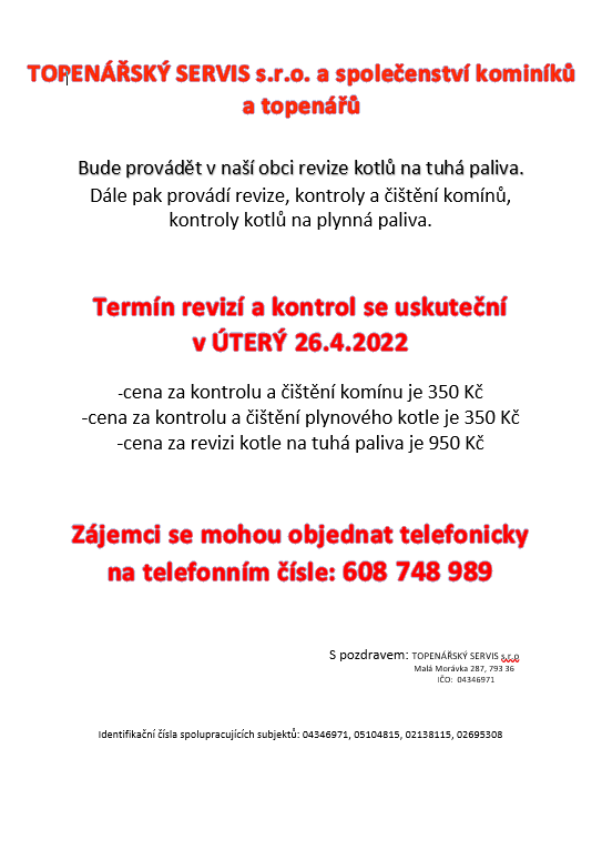 bude provádět v naší obci revize kotlů na tuhá paliva. Dále pak provádí revize, kontroly a čištění komínů, kontroly kotlů na plynná paliva.